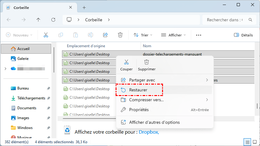 Étape 4. Faites un clic droit dessus et choisissez "Restaurer" pour le renvoyer à son emplacement d'origine.