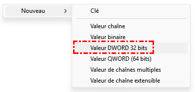 Étape 3. Faites un clic droit sur un espace vide et sélectionnez "Nouveau > Valeur DWORD (32 bits)".