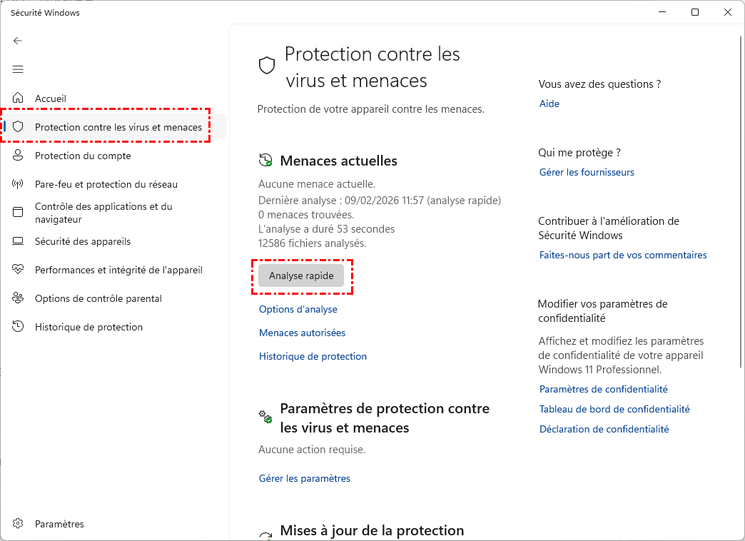 Étape 2. Sous "Protection contre les virus et menaces", cliquez sur "Analyse rapide". L'analyse des virus et logiciels malveillants sur votre ordinateur commencera alors. Si des menaces sont détectées, suivez les instructions pour les supprimer et redémarrez votre ordinateur.