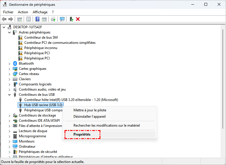 Étape 2. Développez "Contrôleurs de bus série universel" et faites un clic droit sur chaque hub racine USB, choisissez "Propriétés".