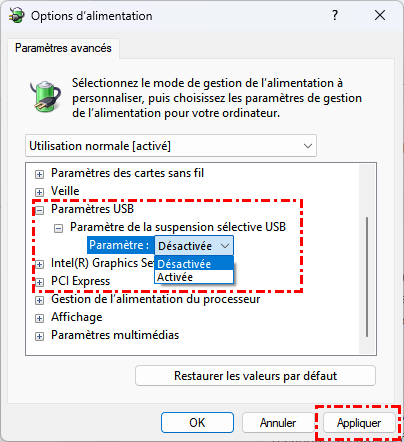 Étape 4. Développez Paramètres USB > Paramètre de la suspension sélective USB, sélectionnez "Désactivé" et cliquez sur "Appliquer".