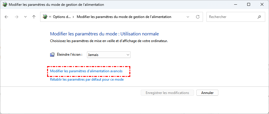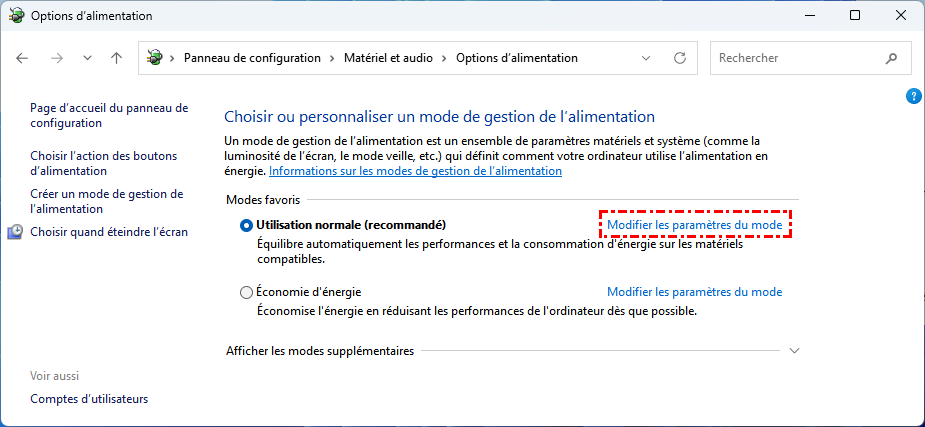 Étape 3. Cliquez ensuite sur "Modifier les paramètres du mode" et "Modifier les paramètres d'alimentation avancés".