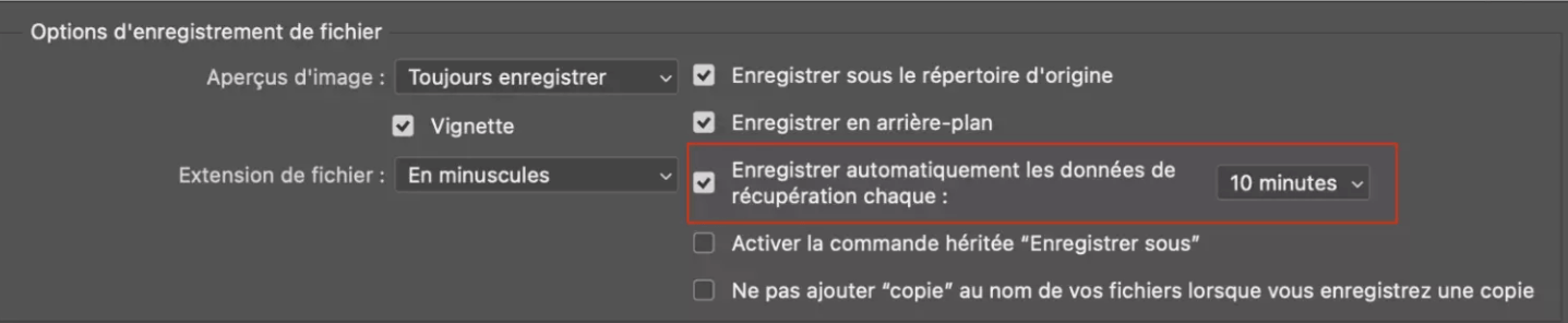 Lancez l'application Photoshop et allez dans Édition > Préférences > Gestion des fichiers. Cochez ensuite Enregistrer automatiquement les données de récupération chaque * minutes., et définissez l'intervalle d'enregistrement automatique à 5 minutes, 10 minutes, 15 minutes, 30 minutes ou 1 heure selon vos besoins.