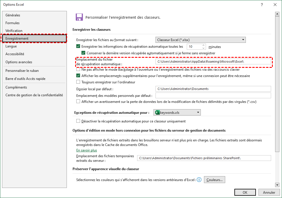 Comme les autres applications Microsoft Office, Excel utilise sa fonction « Récupération automatique » pour enregistrer automatiquement les versions récupérées des fichiers. Cette fonction enregistre périodiquement les feuilles de calcul Excel dans un emplacement temporaire à intervalles réguliers. Si vous avez activé cette fonction au préalable, vous pourrez accéder à vos fichiers lorsqu'ils sont accidentellement supprimés ou corrompus.