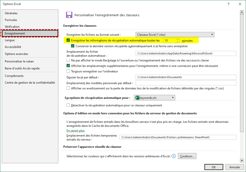 Étape 2. Dans la catégorie « Enregistrement », sous « Enregistrer les classeurs », cochez la case « Enregistrer les informations de récupération automatique toutes les X minutes » et entrez un nombre de minutes.
