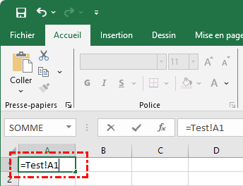 Étape 2. Dans le premier onglet du nouveau classeur, saisissez la formule suivante : =Nom du fichier!A1, où « Nom du fichier » correspond au nom du fichier Excel corrompu sans l'extension. Par exemple, si votre fichier Excel corrompu s'appelle Test.xlsx, vous devez saisir la formule suivante : =Test!A1. Appuyez ensuite sur « Entrée ».