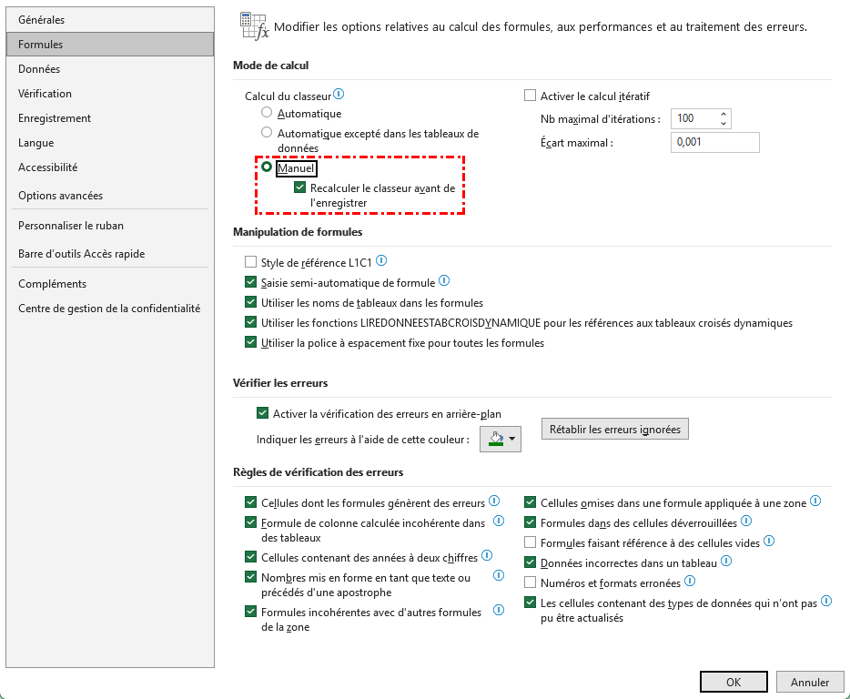 Étape 2. Cliquez sur « Fichier > Options ». Dans la catégorie « Formules », sous « Mode de calcul », sélectionnez l'option « Manuel », puis cliquez sur « OK ».