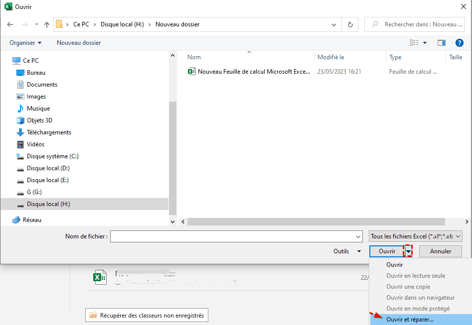 Étape 2. Dans la boîte de dialogue « Ouvrir », cliquez sur la flèche vers le bas à côté du bouton « Ouvrir » et sélectionnez « Ouvrir et réparer ».