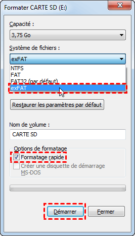 Étape 3 : Assurez-vous que l'option Formatage rapide est cochée. Puis, cliquez sur le bouton Démarrer pour formater et convertir FAT32 en exFAT.
