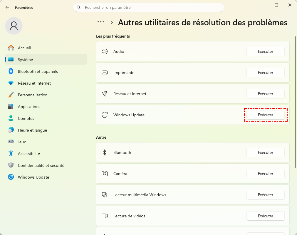 Windows dispose d'un outil intégré très pratique conçu pour détecter et résoudre automatiquement les problèmes liés aux mises à jour. Accédez à Paramètres → Système → Résolution des problèmes > Autres utilitaires de résolution des problèmes, puis exécutez l'outil de dépannage « Windows Update ».