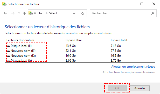 Après avoir vérifié et reconnecté le lecteur, si l'historique des fichiers ne le reconnaît toujours pas, le problème peut être dû à un lecteur endommagé ou à une incompatibilité entre le lecteur et l'historique des fichiers. Dans ce cas, vous pouvez essayer de sélectionner un autre lecteur.