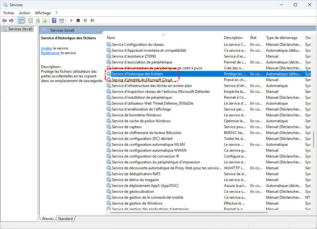 Désactivation accidentelle du service Historique des fichiers : Certains utilisateurs peuvent désactiver le service Historique des fichiers afin de libérer de l'espace sur leur système Windows. S'ils oublient de réactiver l'Historique des fichiers lorsqu'ils souhaitent l'utiliser, le système peut ne pas être en mesure de reconnaître le lecteur.