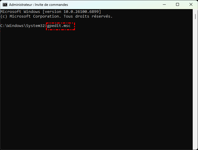 1. Exécutez l'invite de commande en tant qu'administrateur, tapez « gpedit.msc » et appuyez sur Entrée pour ouvrir l'éditeur de stratégie de groupe locale.