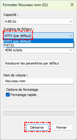Si votre disque de sauvegarde utilise le système de fichiers FAT32, il est préférable de le formater en NTFS ou exFAT, qui prennent tous deux en charge des fichiers plus volumineux. Pour un formatage rapide, il suffit de cliquer avec le bouton droit de la souris sur le disque dans l'Explorateur de fichiers Windows, de sélectionner « Formater » et de choisir NTFS ou exFAT. Enfin, cliquez sur « Démarrer ».