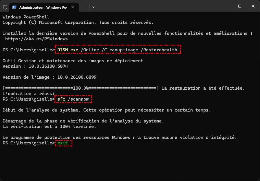 Tapez DISM.exe /Online /Cleanup-image /Restorehealth et appuyez sur Entrée.
