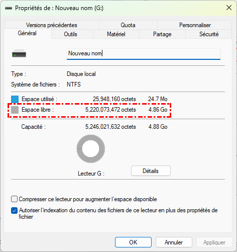 1. Vérifier l'espace disque actuel : Ouvrez l'Explorateur de fichiers (Win + E). Cliquez avec le bouton droit sur votre disque de sauvegarde, sélectionnez « Propriétés » et vérifiez l'espace disponible (comparez-le à la taille de vos fichiers source).