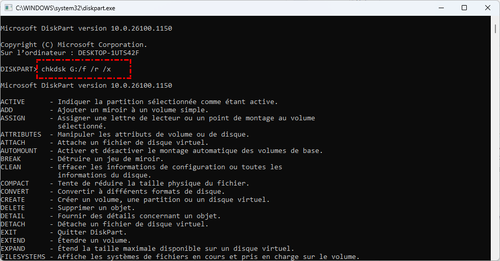Étape 3 : Tapez chkdsk G:/f /r /x et appuyez sur Entrée (remplacez G: par la lettre de lecteur correcte du disque dur externe qui ne s'ouvre pas).