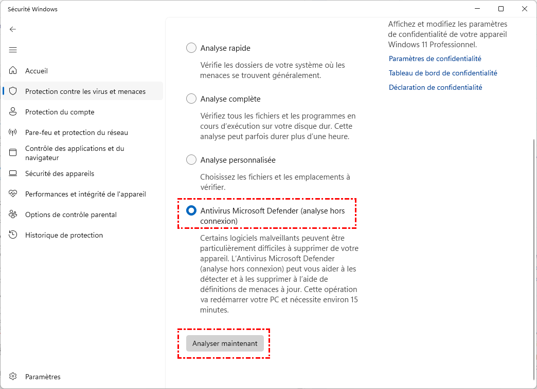 Étape 3 : Sélectionnez « AntivirusMicrosoftDefender(analysehorsconnextion) » et cliquez sur « Analyser maintenant ».