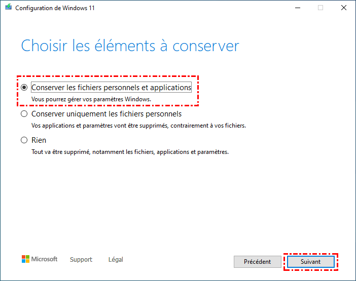 Étape 4. Lors de l'installation, assurez-vous que l'option Conserver les fichiers personnels et applications est sélectionnée.