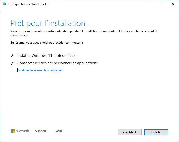 Étape 4. Lorsque vous voyez la fenêtre ci-dessous, cliquez sur le bouton Installer pour réinstaller Windows 11. Si vous souhaitez modifier le type de fichiers que vous souhaitez conserver, vous pouvez cliquer sur Modifier les éléments à conserver.