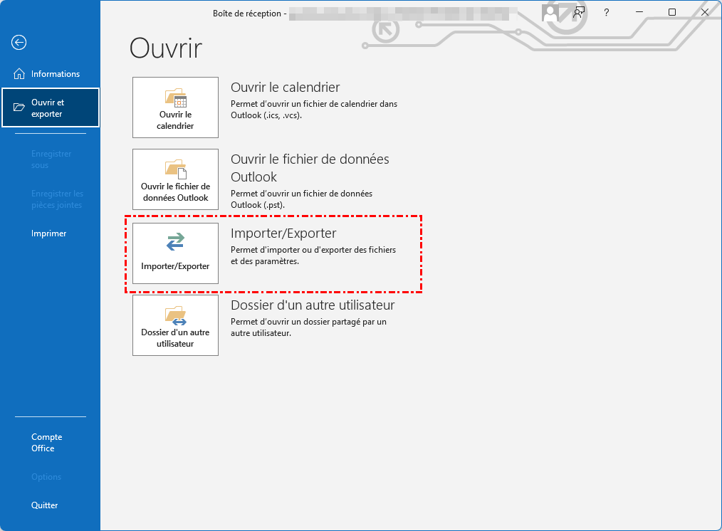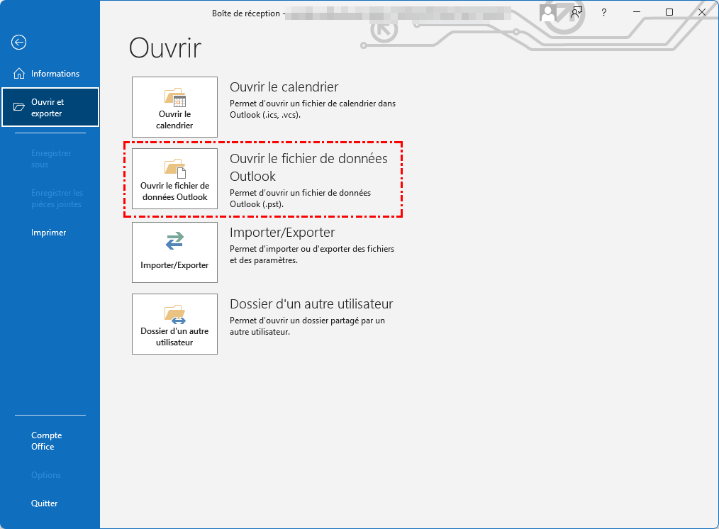 R : Dans Outlook, allez dans "Fichier > Ouvrir & Exporter > Ouvrir le fichier de données Outlook", puis naviguez jusqu'à l'emplacement du fichier PST et ouvrez-le.