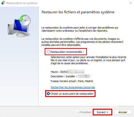 Si la mise à niveau a entraîné une instabilité du système ou une perte partielle de données, restaurez un point de restauration antérieur : saisissez « Créer un point de restauration » dans la barre de recherche Windows. Cliquez sur « Restauration du système » ; choisissez un point de restauration créé avant la mise à niveau. Suivez les instructions pour restaurer votre système.