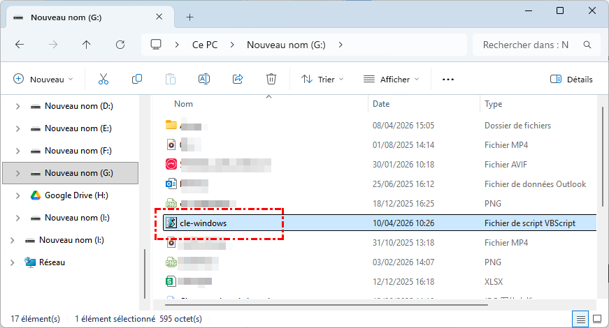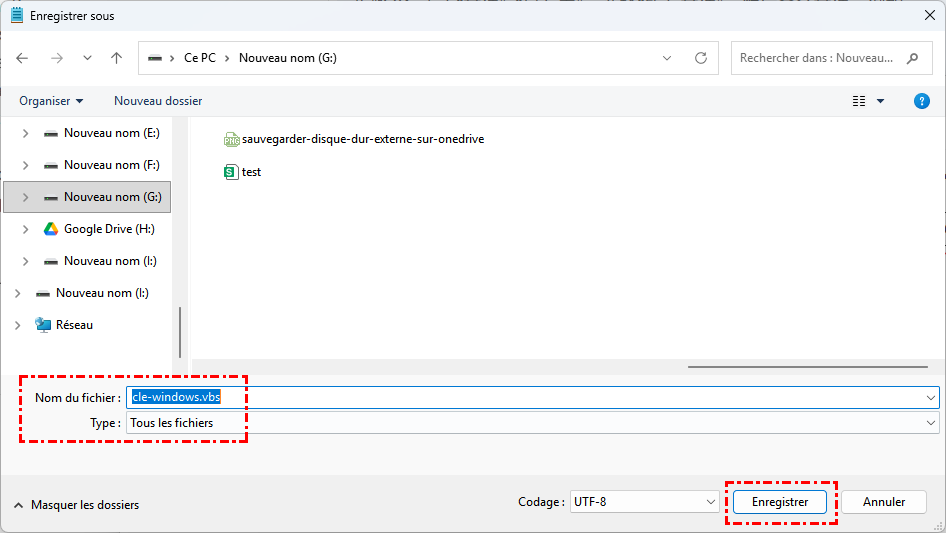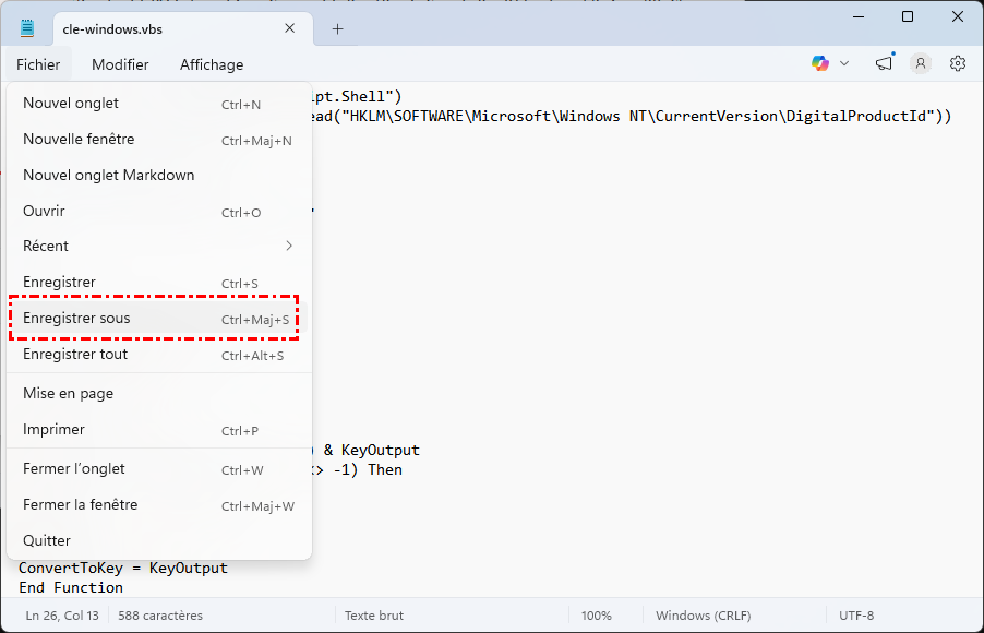 Étape 2. Cliquez sur Fichier > Enregistrer sous, choisissez Tous les fichiers, puis nommez le fichier par exemple clé-windows.vbs(l'icône apparaîtra comme un fichier script avec un symbole d'engrenage).