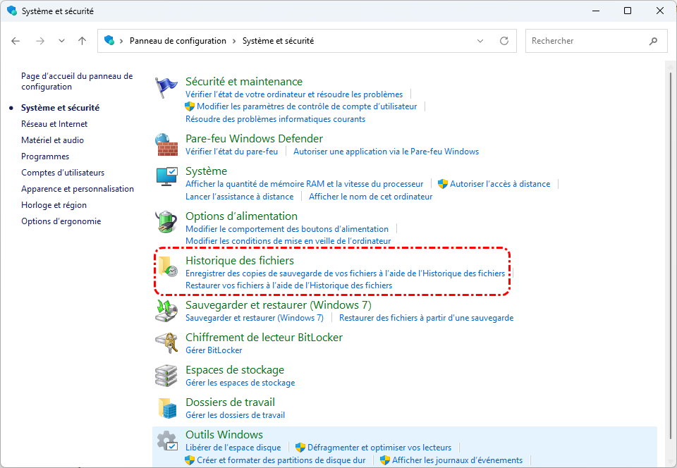 👉Historique des fichiers : Allez dans Panneau de configuration > Historique des fichiers pour vérifier si des sauvegardes existent.