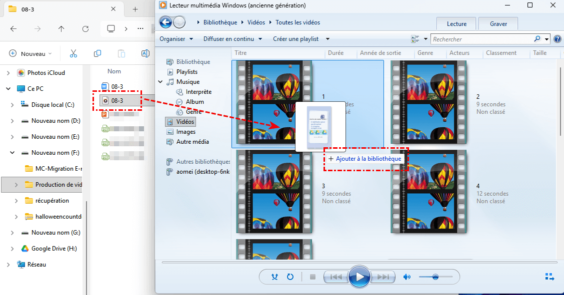 Si vous avez accidentellement choisi de supprimer le fichier uniquement de la bibliothèque, la récupération est simple : Accédez au dossier par défaut sur votre ordinateur où les fichiers multimédias sont stockés (par exemple C:\Users\[VotreNomUtilisateur]\Musique ou Vidéos). Trouvez le fichier supprimé dans ce dossier. Faites simplement glisser et déposez le fichier dans la fenêtre de la bibliothèque de Windows Media Player, et il sera réajouté.