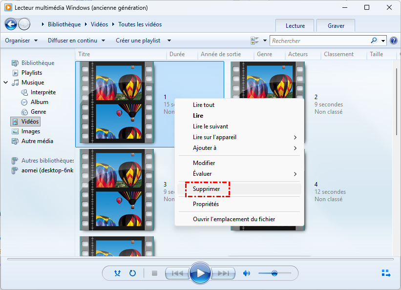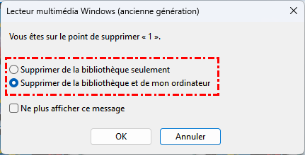- Supprimer uniquement de la bibliothèque : Cela supprime l'entrée de la liste de lecture ou de la bibliothèque de Windows Media Player, mais le fichier original reste présent sur votre ordinateur.