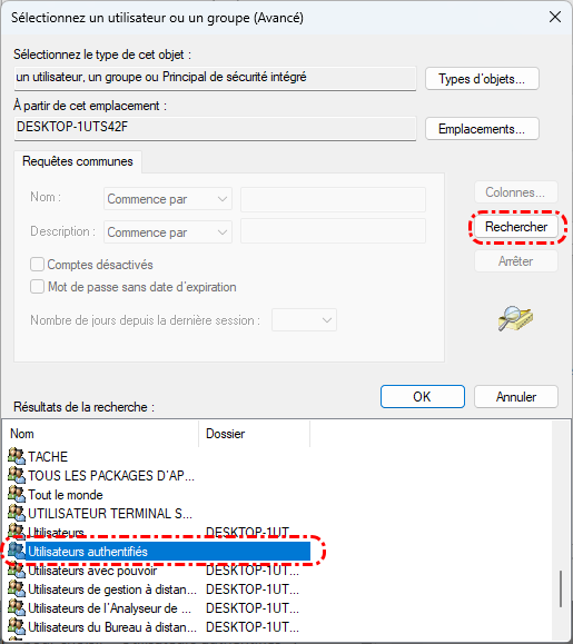 Étape 3. Choisissez Ajouter > Sélectionner un principal > Avancé, puis cliquez sur « Rechercher » pour choisir « Utilisateurs authentifiés ».