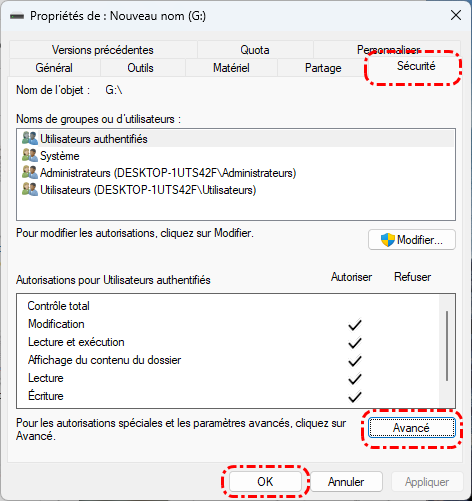 Étape 2. Cliquez avec le bouton droit de la souris pour choisir « Propriétés » et « Sécurité », puis sélectionnez « Avancé » pour modifier l'autorisation, et enfin cliquez sur « Modifier les autorisations ».