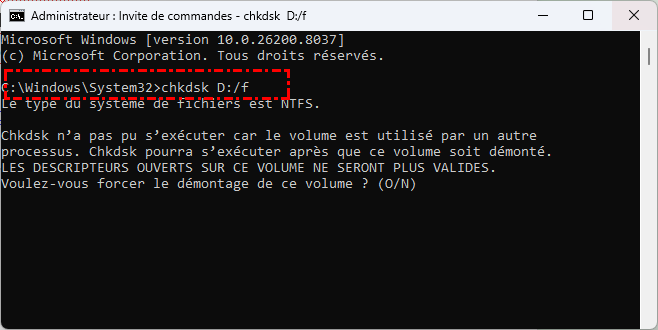 Étape 2 : Exécutez la commande suivante pour corriger les erreurs : chkdsk D: /f
