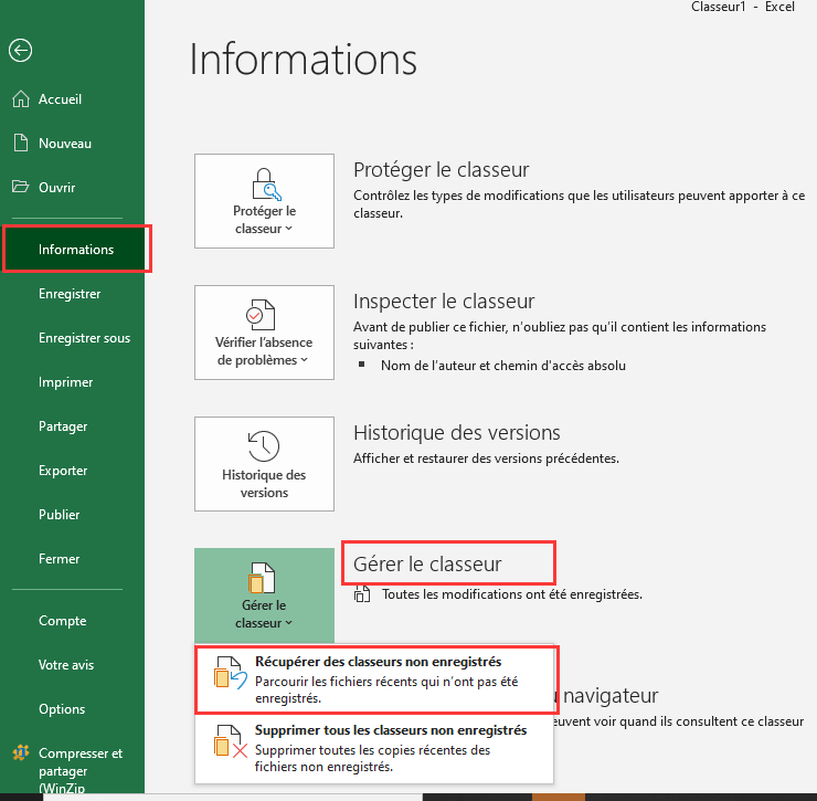 1. Ouvrez Excel et cliquez sur Fichier > Informations > Gérer le classeur. Cliquez sur Récupérer des classeurs non enregistrés.