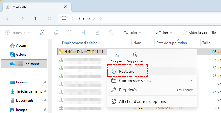 Étape 3 : Si vous trouvez le fichier, faites un clic droit dessus et sélectionnez « Restaurer ». Il sera alors replacé dans son dossier d'origine.