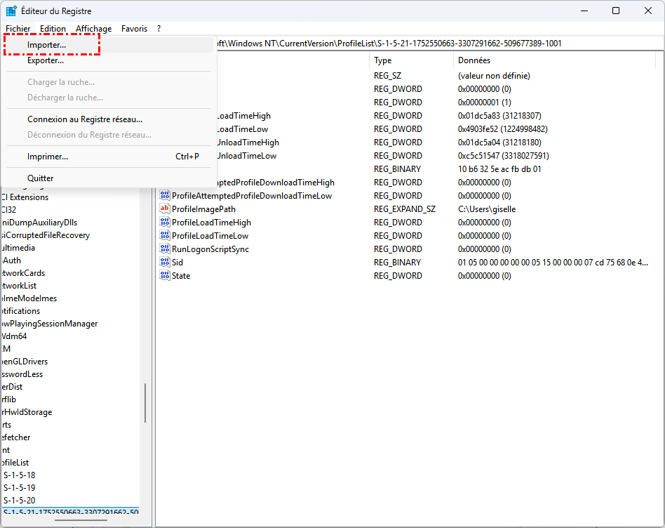 2. Fusionner la sauvegarde : Double-cliquez sur le fichier « .reg » > cliquez sur « Oui » pour confirmer. Vous pouvez également ouvrir « Éditeur du Registre (regedit) » > « Fichier » > « Importer » > sélectionnez le fichier « .reg ».
