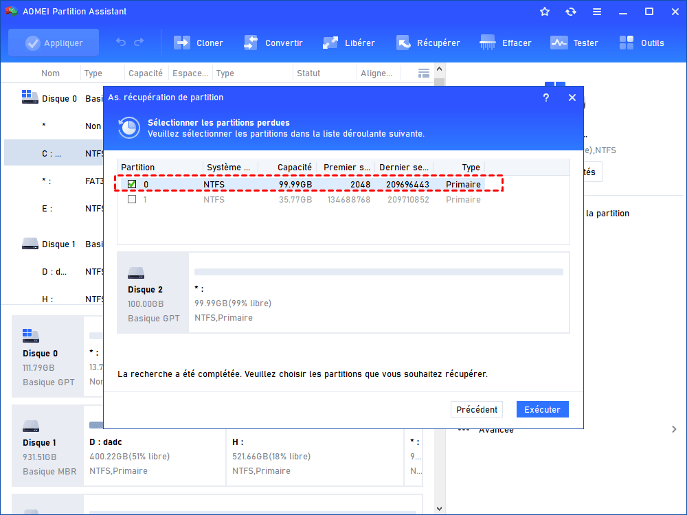 Étape 5 : Sélectionnez la partition perdue et cliquez sur Exécuter. Une fois le message de confirmation affiché, cliquez sur Terminer pour fermer cette fenêtre.