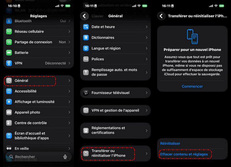 Étape 1. Allez dans « Réglages » > « Général » > « Transférer ou réinitialiser l'iPhone » > « Effacer contenu et réglages ».