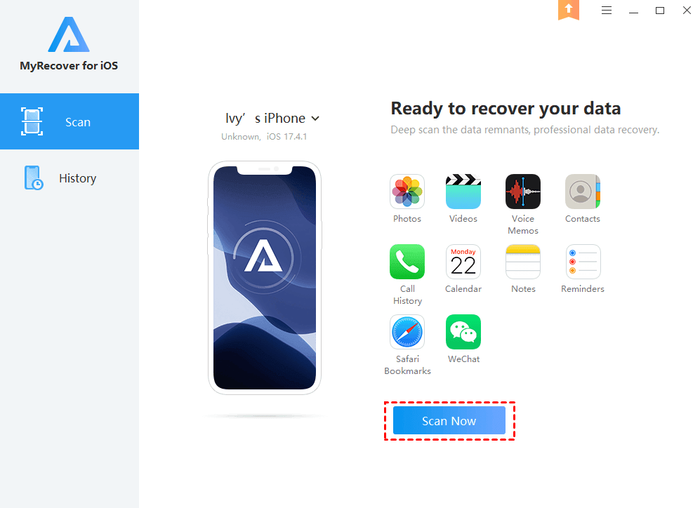 Étape 3. Cliquez sur « Analyser maintenant » dans MyRecover pour iOS afin de rechercher les fichiers perdus sur votre iPhone.