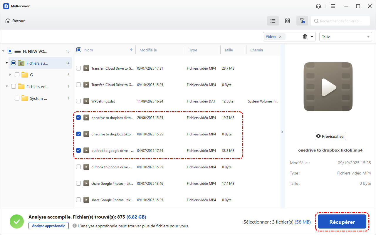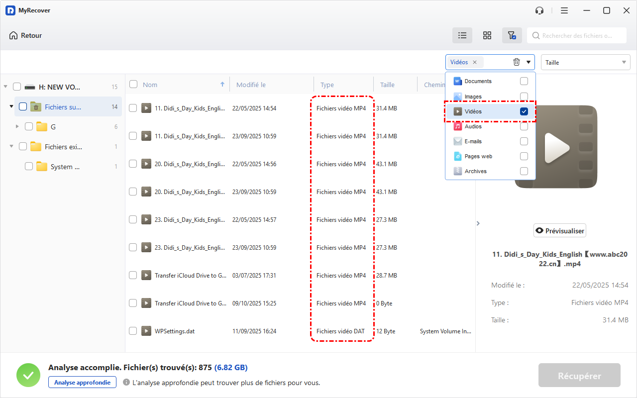 - Récupération sélective : Récupérez uniquement les vidéos dont vous avez besoin. Filtrez par type ou nom de fichier.