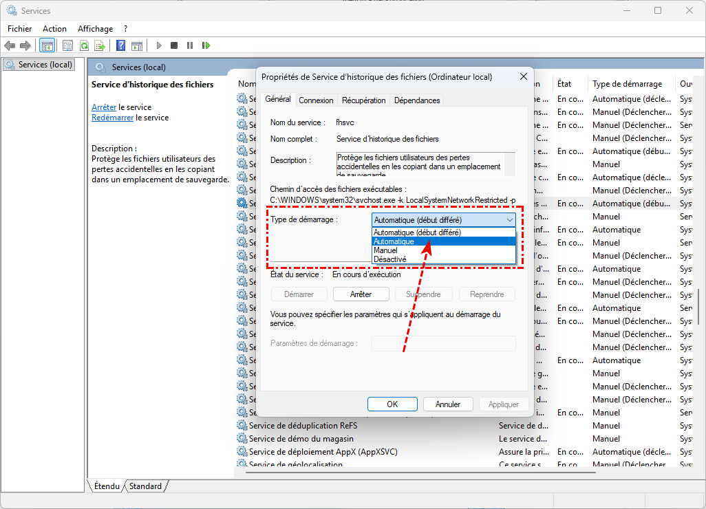 2. Redémarrer le service Historique des fichiers
