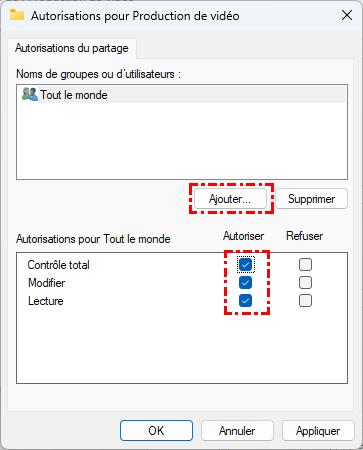 Étape 3. Assurez-vous que votre « compte utilisateur » (ou « Tout le monde ») dispose des autorisations « Modifier/Contrôle total ».