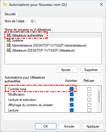 Étape 4. Cochez « Contrôle total » sous « Autoriser » -> Cliquez sur « Appliquer » -> « OK ».