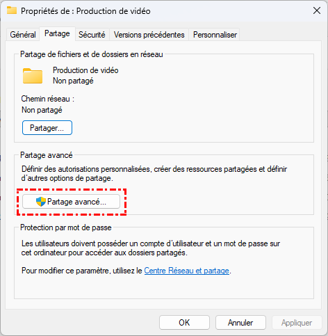 Étape 1. Sur l'ordinateur partageant le dossier, faites un clic droit dessus -> « Propriétés » -> Onglet « Partage » -> « Partage avancé ».