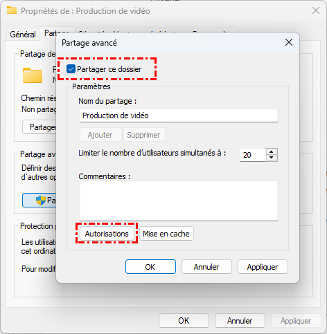 Étape 2. Cochez « Partager ce dossier » -> Cliquez sur « Autorisations ».