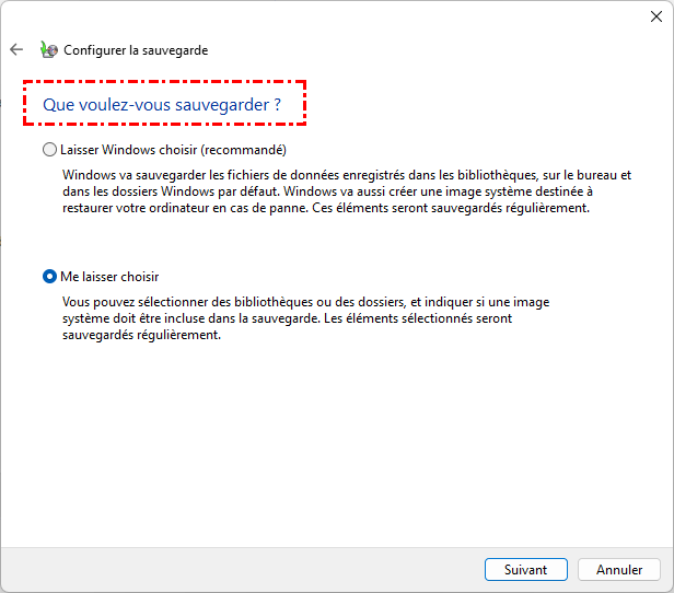 - Laisser Windows choisir (par défaut, sauvegarde les bibliothèques, le bureau et les fichiers système).