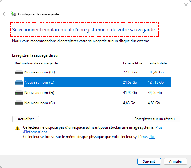 - Sauvegarde sur lecteur externe ou réseau : Nécessite un lecteur USB externe, un lecteur interne secondaire ou un emplacement réseau (NAS ou dossier partagé).