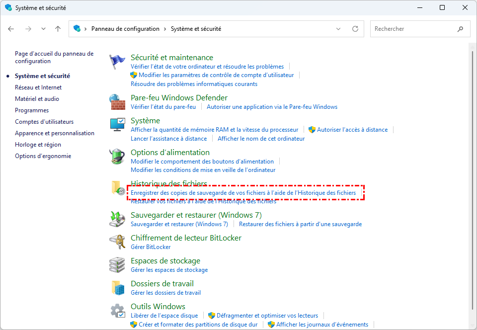 Appuyez sur Win+R, tapez control et validez avec Entrée. Accédez à Système et sécurité -> Historique des fichiers. Si l'option y est visible, configurez votre lecteur de sauvegarde.
