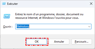 Appuyez sur Win+R, tapez filehistory et appuyez sur Entrée. Cela devrait ouvrir directement la fenêtre de sauvegarde de l'Historique des fichiers.