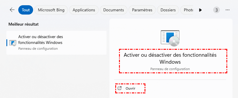 1. Appuyez simultanément sur les touches Win+S, tapez Activer ou désactiver des fonctionnalités Windows. Cliquez sur Ouvrir sous le résultat correspondant.